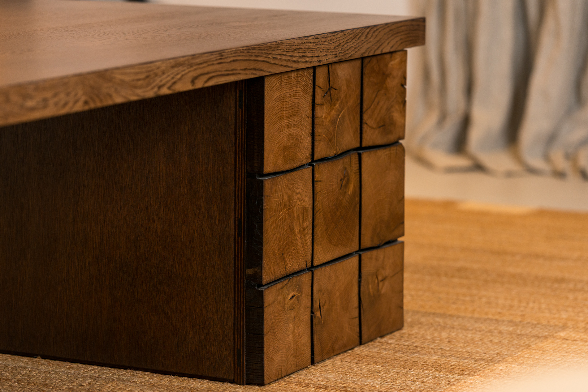 Gewaef is made from solid European oak, featuring a 1600×800mm tabletop, made from 3–5 oak boards, straight edge, finished in hardwax oil Osmo Terra (semi-matt). Table is paired with an asymmetrical base. One leg mirrors the top in matching oak; the other is a hollow box, clad in slices of salvaged barn beams - shaped, stabilised with epoxy, and bonded with black resin. The visual contrast is intentional, but the table remains balanced and grounded. Each piece is shaped and finished by hand.