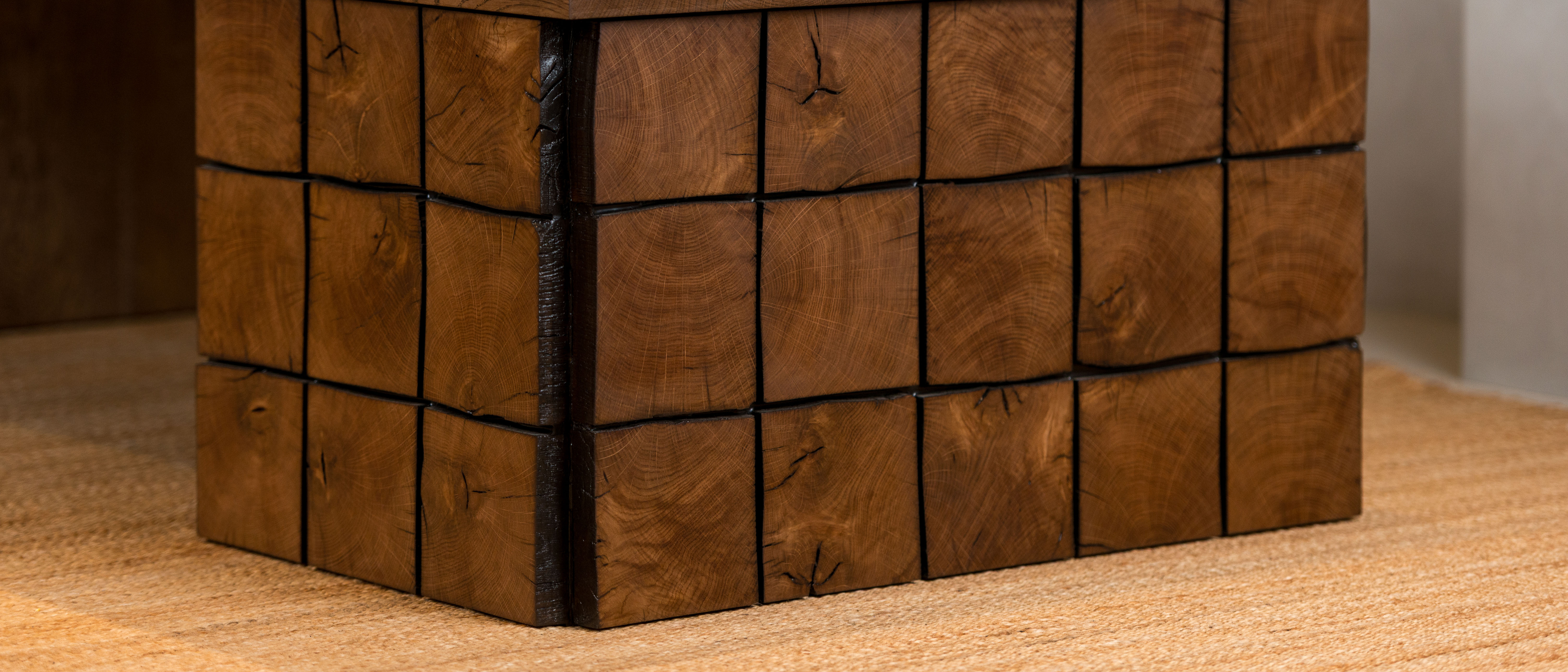This is a fusion of old and new. Barn beam ends cut into squares, set in black resin, bonded around a hidden ply core. Each one was chosen by grain. Top matched in colour, not contrast.